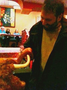 To Simon, I got a chance to ask how he tuned his bouzouki! He said GDAD–and those of you who know my and Dara’s musical preferences know we like our zouks in GDAE. (You may also even know that if you’re one of the couple hundred people who’ve read Faerie Blood!) So we chatted a bit about that. And Simon modestly claimed he’s not actually that good a bouzouki player. Dara and I would like to call affectionate bullshit on that, as we have just spent an entire show watching that boy play.