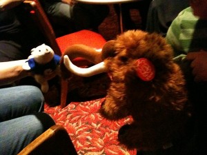 When we finally took our leave so the nice folks who owned the place could close up (and the band could go and do something wacky like oh, I dunno, sleep or something), the swag/promoter/MC guy laughingly pretended to snog my mammoth. Dara and I cracked up at this, and I told him the mammoth would remember this night for the rest of its fuzzy little life.