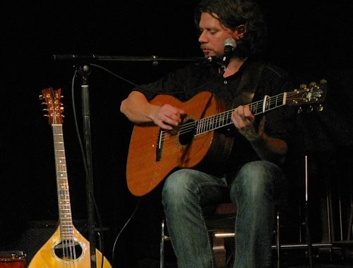 The show itself, crowd-wise, was a bit more sedate than I’d have liked–this was a sit-down type crowd for the most part, generally older than Dara and me, but things got lively in the second set once Genticorum got the participatory stuff going. And while they’re not as much of a powerhouse on stage as Le Vent (which would be difficult without a hurdy gurdy), make no mistake, these boys are nimble of style, deft of vocals, and quite, quite funny. Alexandre is an excellent flutist (and a good fiddler and bass player, for that matter); Pascal has a distinctive hand on his fiddle AND showed fun variety of podorythmie style; and Yann, their guitarist, kept things moving nicely with his rhythm support.