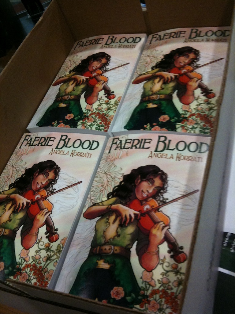 Check it out, you guys, I have the first drop of Faerie Blood! Here’s a big box of half-Sidhe fiddle player, ready to rock, and the redoubtable printing machine handing me one of the books too!