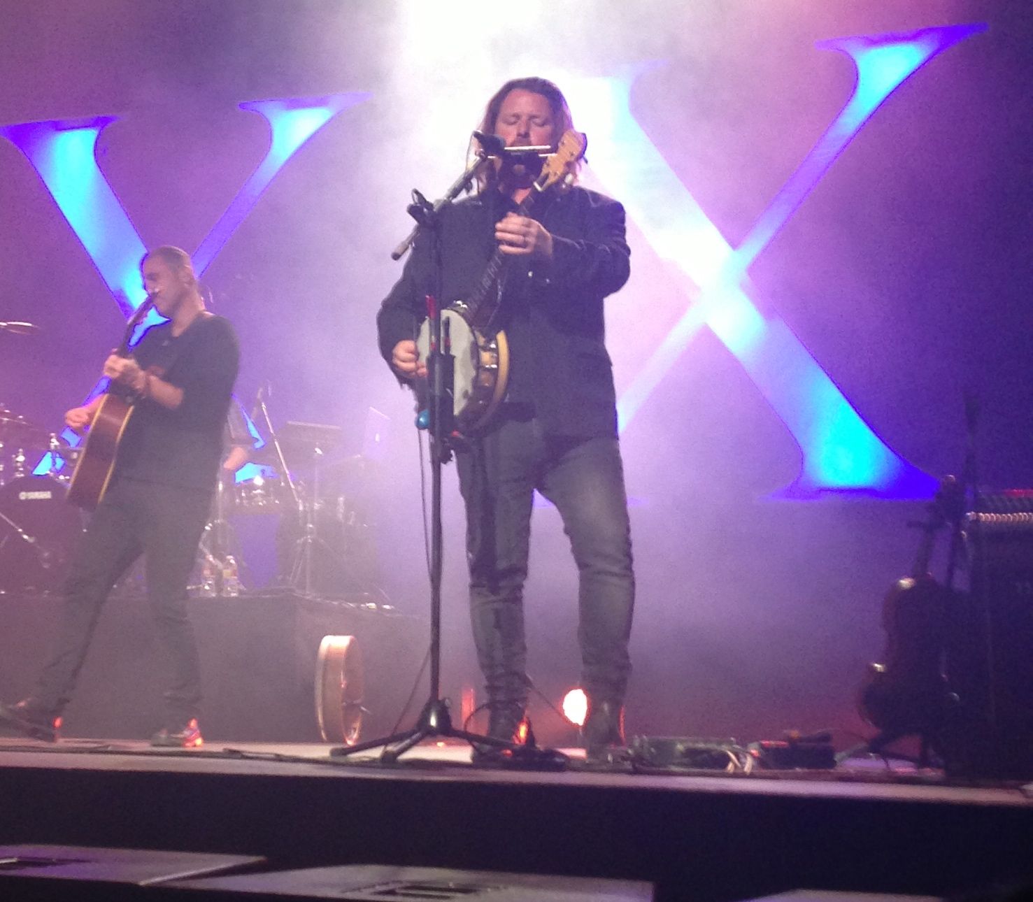 Now that I’ve got an iPhone 5 I’m a bit better at taking concert pics than I used to be–so here’s the best shot I got of all of the B’ys (at least the front-line ones, since Kris as always is in the back)! As y’all can see, mostly everybody was favoring black and/or denim, in casual mode, although Bob was swanking it up a bit since he actually had on a jacket. I do not envy him the weight of that jacket under stage lights.
