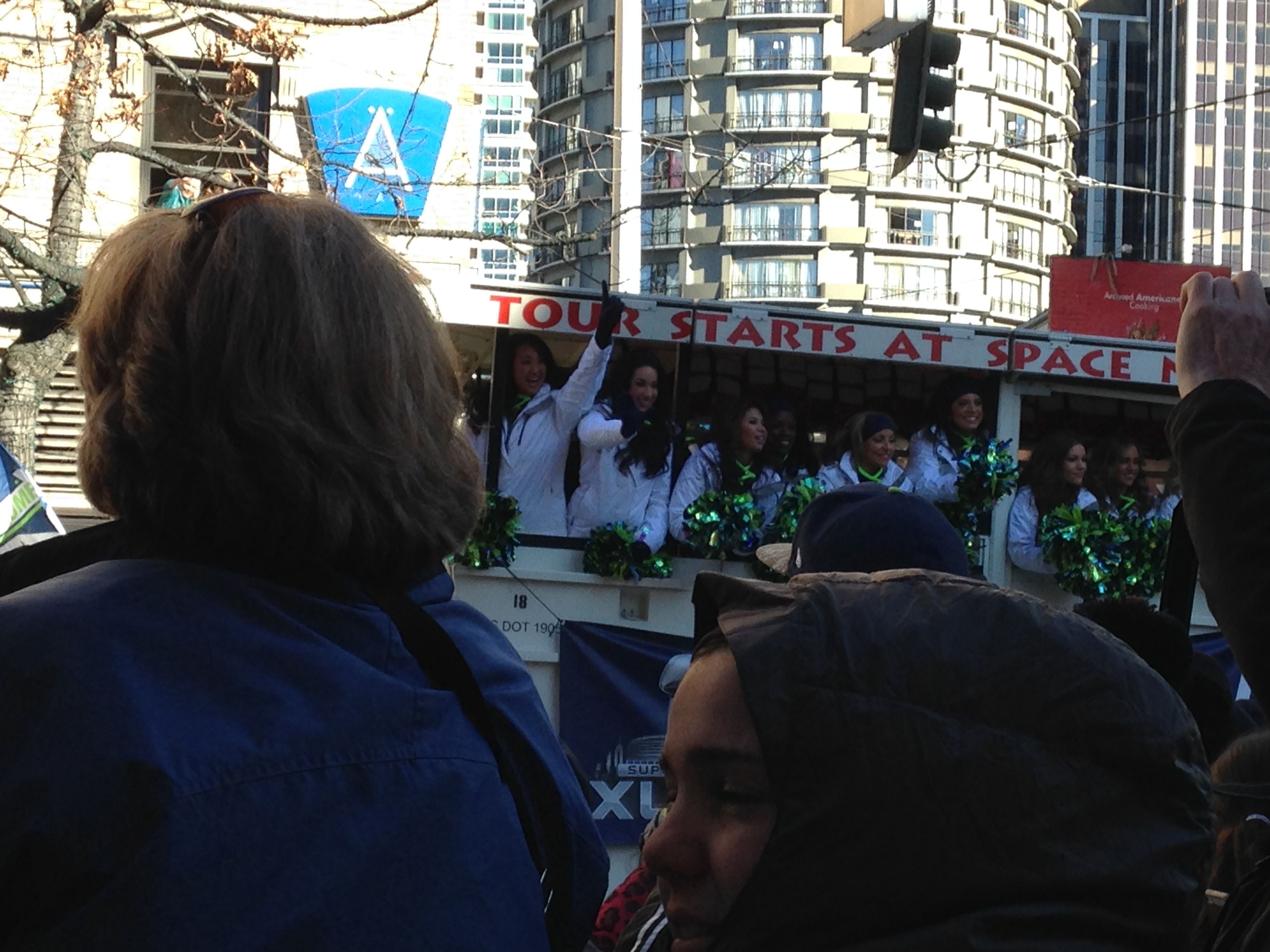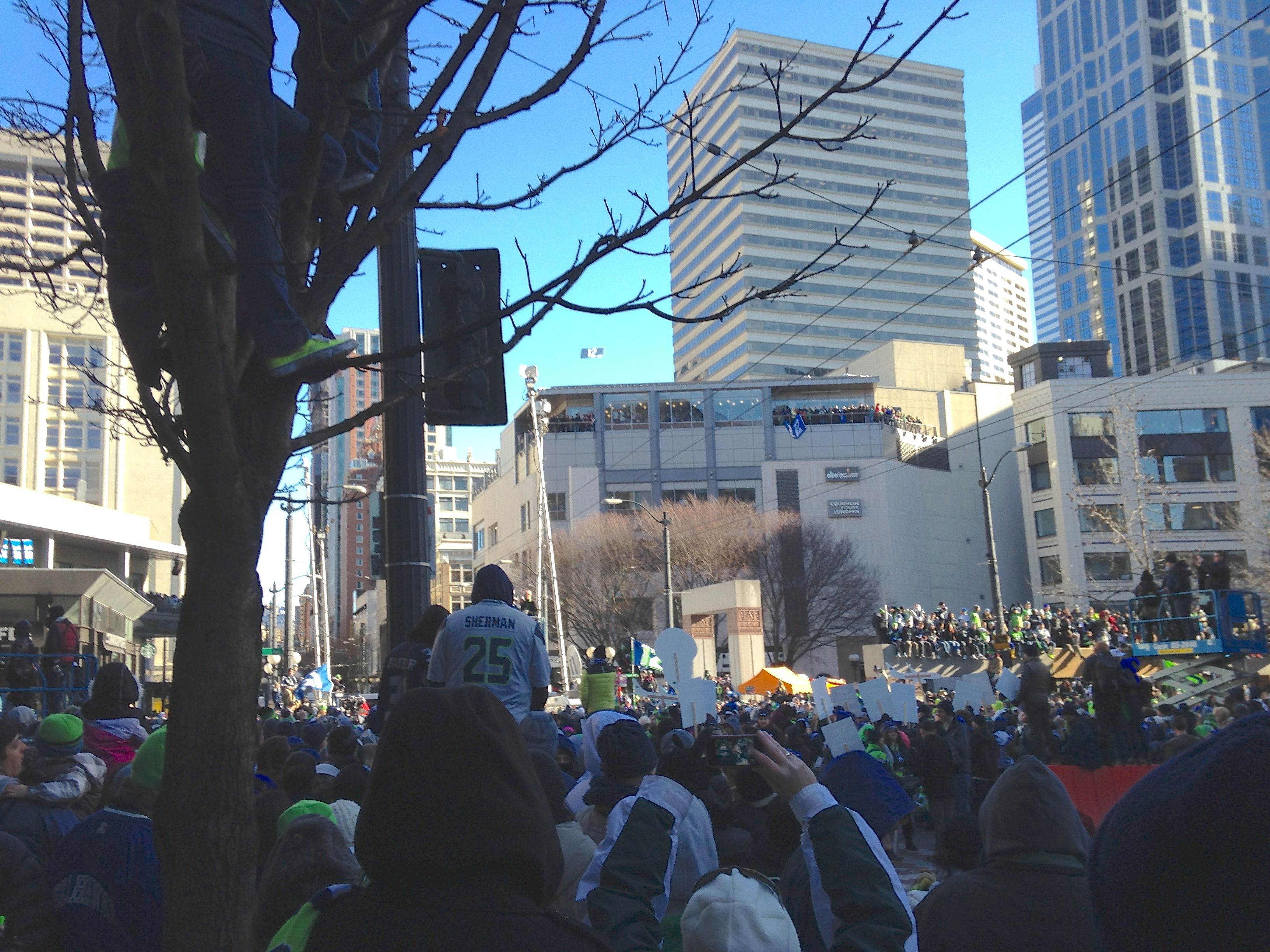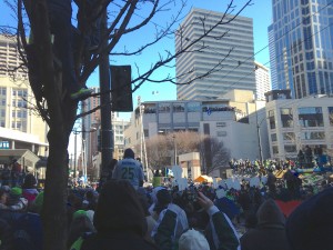 So I started wandering back and forth between Union, Pike, Pine, and Stewart, trying to find a good vantage point and to see if I had a prayer of seeing ANYTHING over the heads and shoulders of taller people already pressed in tight along the sidewalks. I didn’t try TOO hard, though–partly because I figured that the actual football fans had better right to have a view than I did, and partly because moving around actually kept me warmer in the cold.