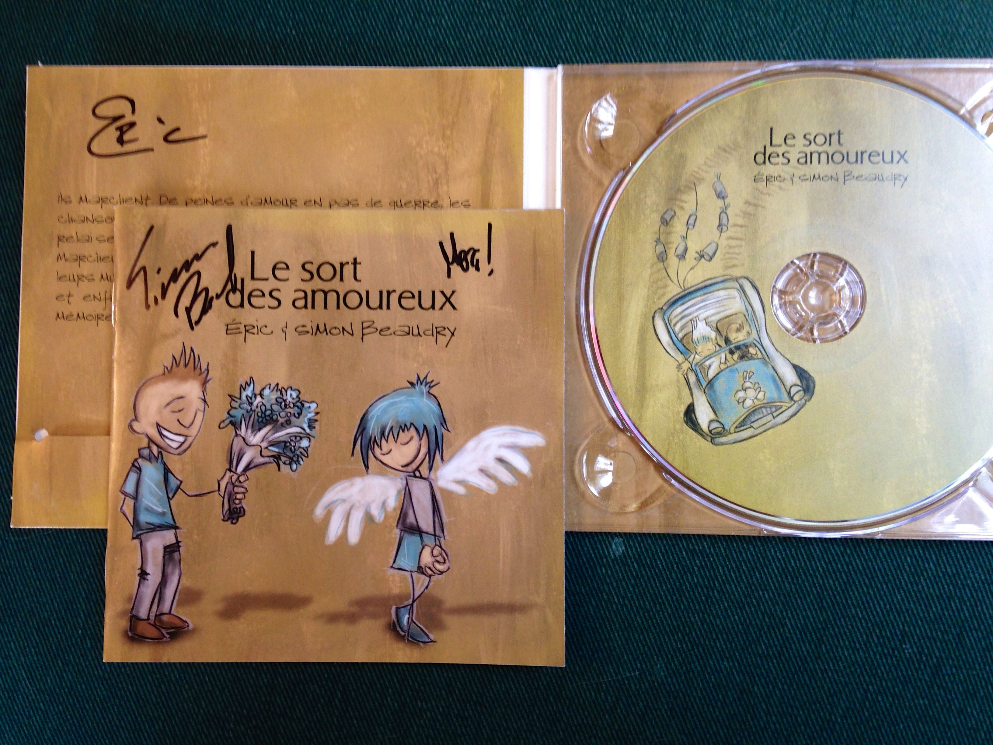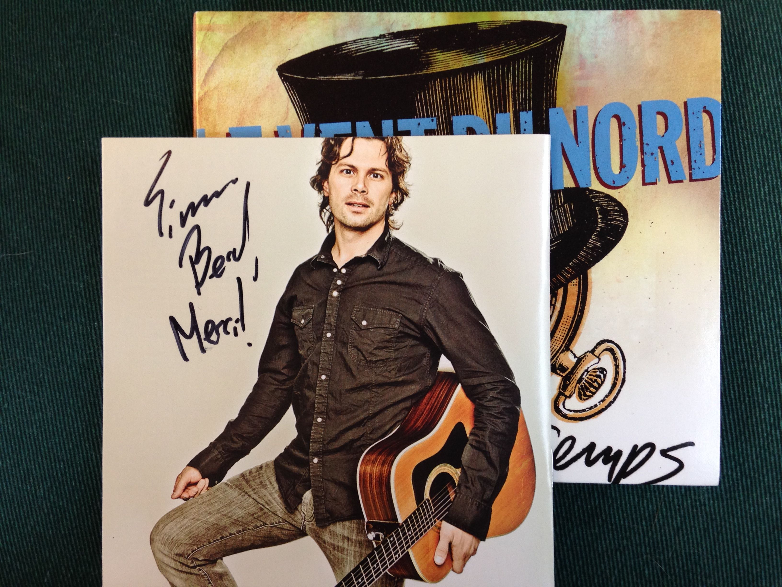 As everyone drifted out into the lobby, I did eventually find Ginny and Gary and Carol and say hi to them all. But I also found the band as they came out to say hello to everyone. I do believe I enthused at Olivier first, and then I started asking all the boys to sign my copy of Tromper le temps. AND, since I’d brought it along as well, I asked Simon to sign my copy of Le sort des amoureux as well, since his brother had signed it the week before.