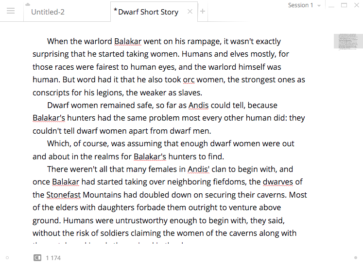 Now, as y’all know I’m a big fan of Scrivener, which will continue to be my go-to tool for dealing with larger projects. On the other hand, if I want to write something short (say, the extremely rare short story), I sometimes feel that Scrivener’s actually a bit too complex a tool for that. Sometimes I just want to whip something out in a text editor and not have to worry about a lot of bells and whistles.